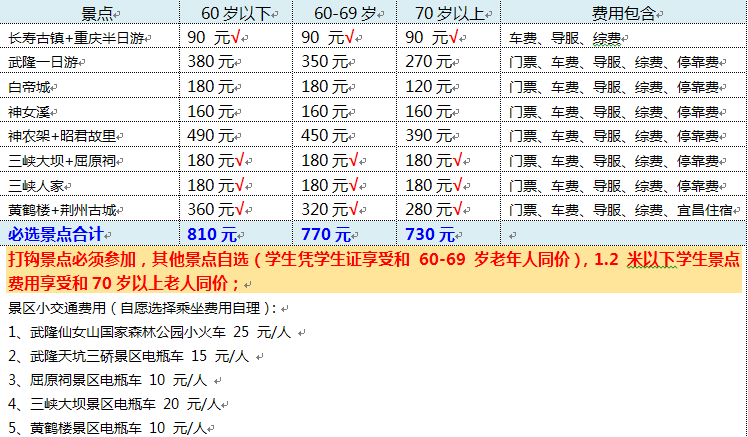必選景點(diǎn)  長(zhǎng)壽古鎮(zhèn)+重慶半日游、三峽大壩+屈原祠、三峽人家、黃鶴樓+荊州古城 60歲以下+810元;60-69歲+770元;70歲以上+730元