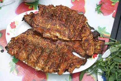 熱菜:烤紅鱒、排骨豆角面筋、鍋?zhàn)兴岵税兹狻⑿◆~(yú)燉豆腐、肉片芹菜、土豆燒茄子、絲瓜雞蛋、炸花椒芽