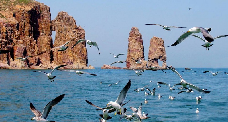 早餐后,乘車赴榮成,游覽素有“海鷗王國”之稱的--海驢島(乘船進(jìn)島上單程航程約20分鐘,島上游覽約2小時)海驢島每逢春季,成千上萬的海鷗來此棲息產(chǎn)卵,巖縫中鳥巢鱗次櫛比,數(shù)不勝數(shù),島上威峰兀立,四周海水浩瀚碧藍(lán),與成千上萬只海鷗構(gòu)成的雄偉景觀,不僅令人嘆為觀止,神凝形釋,故海驢島有“海鷗王國”之雅號。海驢島相傳為二郎神當(dāng)年用扁單挑著一只雞和驢過海時,因天將破曉,雞鳴驢嚎,不慎將雞和驢落入海中而化為雞鳴島和海驢島。海驢島是鳥的世界,登上海驢島,只見島上海鷗遍地。眾多的海鷗“咕咕”地叫著,像是歡迎我們游人的到來。由于島上尚無居民,也沒有其它天敵,故海鷗之繁衍越演越烈。有時一大群海鷗同時棲息在一塊巖礁上,必乎覆蓋了整個巖礁,遠(yuǎn)遠(yuǎn)望去,宛若一塊潔白的冰山呢……