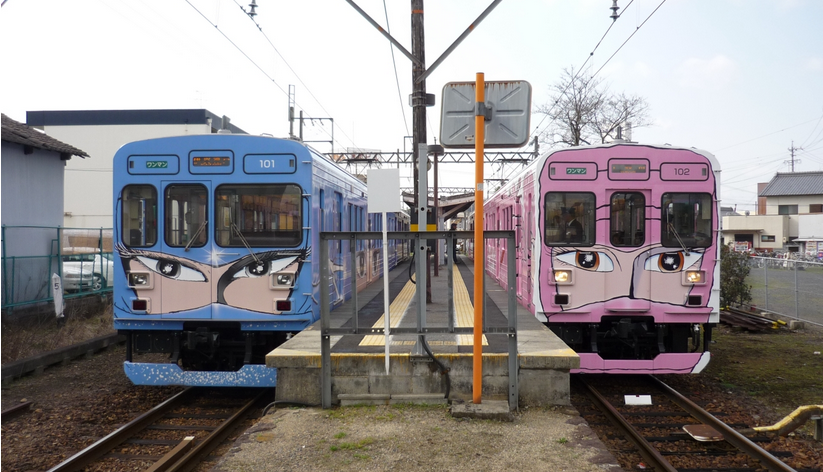 【忍者列車】伊賀市以「忍者的故鄉(xiāng)」聞名于世。在城市中心有只有在伊賀才可以看到的整個車體繪有忍者造型的電車。 這個電車在當地被大家親切地稱為:忍者列車、KUN?(女忍者)列車,并且有很多鐵路迷到訪此地。忍者列車由綠色、粉色、藍色三種顏色構成,不管是哪一種,車前方和側方都繪有松元零士設計的,閃閃發(fā)光細長眼的KUN?的特寫,猶如疾馳的KUN?。