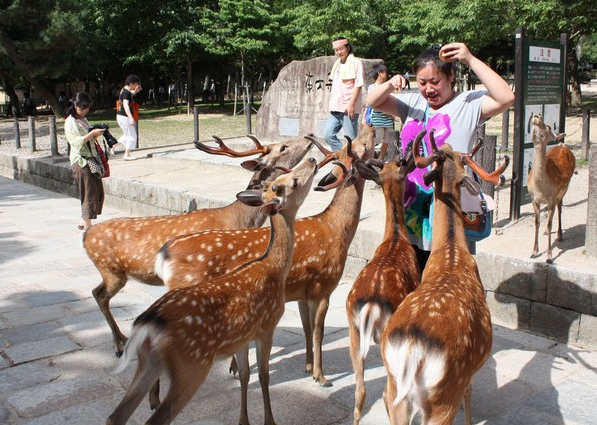 前往大阪的象征●【大阪城公園(不登城)】(不少于40分鐘)游覽,歷史悠久的大阪城,系豐臣秀吉于1586年所建,是由雄偉的石墻砌造而成,大阪城公園內(nèi)城中央聳立著大阪城的主體建筑天守閣,巍峨宏偉,鑲銅鍍金,十分壯觀。登上高五層八階的天守閣,可以瞭望整個(gè)大阪市。如今大阪城已被定為特別史跡。城內(nèi)的歷史博物館里保存有豐臣秀吉的木像、武器和美術(shù)作品等。大阪城公園內(nèi)除了著名的大阪城天守閣外,還有大手門(mén)、千貫櫓、火硝藏等13座被指定為重要文化財(cái)產(chǎn)的古建筑以及梅林和西丸庭園等。在西之丸庭園,有一片寬闊的草原和曾遭祝融燒毀并再度重建的外堀、太平門(mén)等古跡,是散步休閑的好去處。公園內(nèi)廣栽各種樹(shù)木,每逢花季是賞櫻、賞梅的勝地,堀岸更可以看到一家扶老攜幼觀賞水邊野鳥(niǎo)的溫馨畫(huà)面。這里不僅是深受大阪市民喜愛(ài)的都會(huì)綠洲,更有不少來(lái)自日本國(guó)外的游客觀光游覽。城墻四周建有護(hù)城河,附近有風(fēng)景秀麗的庭園和亭臺(tái)樓閣。漫步河邊,奇花異卉,滿目青翠,充滿詩(shī)情畫(huà)意。城內(nèi)櫻花門(mén)頗為著名,當(dāng)年大阪城遭遇火災(zāi),僅這一道全部用巨石砌成的櫻花門(mén)屹立無(wú)恙,成為目前僅存的遺跡。后前往有著“大和國(guó)”和“精神之鄉(xiāng)”之稱的日本古都之一的——奈良,現(xiàn)今的奈良市仍保持著日本古典風(fēng)格,抵達(dá)后游覽奈良