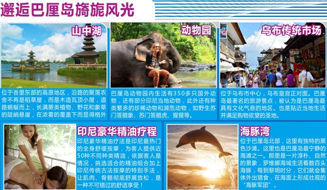 鷹航或新航轉(zhuǎn)機,入住1晚海豚灣海邊4星+5晚當(dāng)?shù)?星酒店,巴厘島2天自由活動,特別安排印尼式精油按摩1小時、北部海豚灣乘船海上追逐海豚