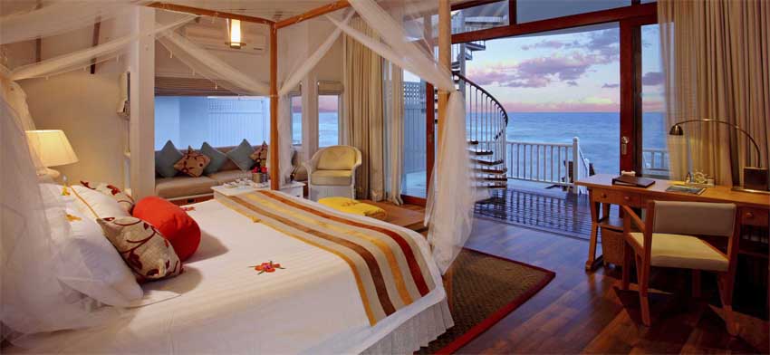 20套豪華日落水上屋,可同時入住3大人或2大人+1兒童,房間包含King Size 大床間或兩張單人床臥室, 起居室,帶有浴缸的和淋浴噴頭的衛(wèi)生間,空調(diào),平面衛(wèi)星電視,音響,mini-bar,保險箱,IDD電話,Internet網(wǎng),吹風(fēng)機,茶/咖啡機。觀景陽臺。