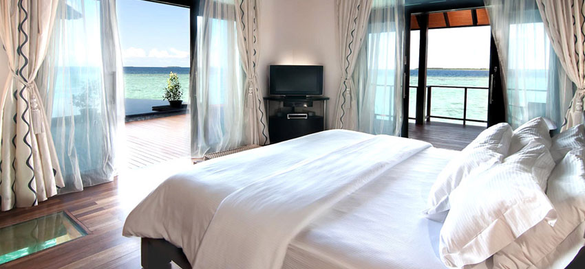 水上寓所可以一攬印度洋全景,由兩個(gè)臥室組成,還配有套房,游泳池,水療中心,私人餐廳等,休息室有40寸LCD娛樂控制臺(tái),該房型可以滿足客人的所有需求。