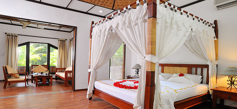 所有的12間花園豪華別墅都坐落在島的中部,面對翠綠的灌木叢及新建的游泳池.這是純木制結(jié)構(gòu)房間,外面有獨用的天井,精制的家俱.房內(nèi)設(shè)施包括:木造的四腳大雙人床,小酒吧,國際直撥電話,空調(diào),沖涼浴室, 冷水和熱水供應(yīng), 吹風(fēng)機,衛(wèi)星電視,茶/咖啡/調(diào)制機,電子保險柜.