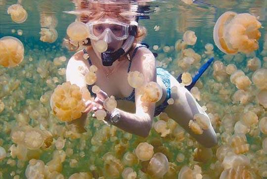 (2)在大斷層浮潛歸來之后,在長(zhǎng)沙灘島上享用美味的BBQ午餐,退潮時(shí)海中央會(huì)露出綿延2公里細(xì)長(zhǎng)的潔白沙灘,海洋猶如被分割兩半,是拍照的絕佳取景點(diǎn)哦!愛美愛拍照您前往不能錯(cuò)過!離開長(zhǎng)沙灘后乘快艇前往世界公認(rèn)的七大奇觀之首的【水母湖】,翻過一座小山便能抵達(dá),二戰(zhàn)時(shí)美軍偵察機(jī)飛過此地,發(fā)現(xiàn)湖面金光閃閃,以為是山中的寶藏,結(jié)果發(fā)現(xiàn)是由于湖中成千上萬的黃金水母在中午時(shí)分浮上水面進(jìn)行光合作用。這些水母常年不受到外界天敵的威脅而退化到無毒。當(dāng)你置身于成千上萬、大大小小、粉橘透明、軟軟Q彈的水母群之中,那感覺難以言喻的美妙,是前所未有的奇妙體驗(yàn)!
