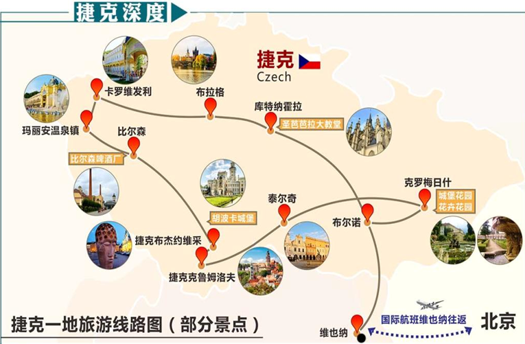 行程特色  捷克溫泉圣地--卡羅維發(fā)力+瑪利亞溫泉城、啤酒之都--皮爾森+布杰約維采、南摩拉維亞省首府--布爾諾