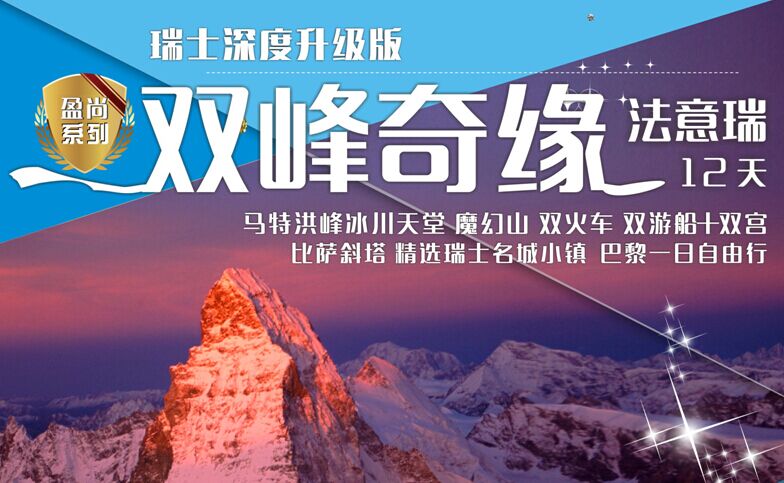 行程特色  雙雪山(瑞士標(biāo)志馬特洪峰、達(dá)沃斯魔幻山);雙游船(巴黎塞納河游船、貢多拉游船);雙古堡小鎮(zhèn)(西庸城堡、“歐洲好萊塢”楚格);雙宮含講解(巴黎盧浮宮、法國凡爾賽宮);三大度假勝地(滑雪勝地達(dá)沃斯、冰城采爾馬特、蜜月之都琉森);世界遺產(chǎn)名城(羅馬、佛羅倫薩、比薩、威尼斯)