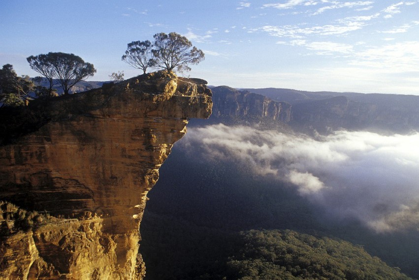 【藍(lán)山國家公園】:座落在新南威爾士州境內(nèi),距離悉尼市區(qū)約100公里,海拔1000 – 1200公尺。藍(lán)山全地區(qū)生長著龐大的原始森林和亞熱帶雨林,里面有90種不同品種的尤加利樹及超過400種的動物種類。藍(lán)山總是被一層淡藍(lán)色遮蔽,顯得異常美麗,亦透著神秘,藍(lán)山也因此得名。