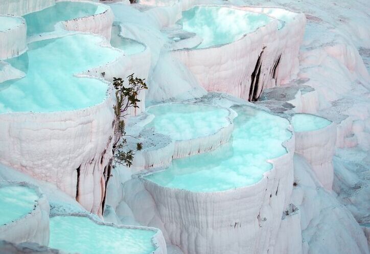 ※ 棉花堡:棉花堡(Pamukkale)在土耳其的紡織工業(yè)重鎮(zhèn)代尼茲利(Denizli),位于西南部山區(qū)。土文Pamukkale由Pamuk(棉花)和Kale(城堡)兩個字組成,棉花是指其色白如棉,遠看像棉花團,其實是堅硬的石灰?guī)r地形。城堡是說它由整個山坡構(gòu)成,一層又一層,形狀像城堡,故得名棉花堡。此地多溫泉,溫泉自洞頂流下,將山坡沖刷成階梯狀,平臺處泉水蓄而成塘,人可坐在里面泡溫泉。