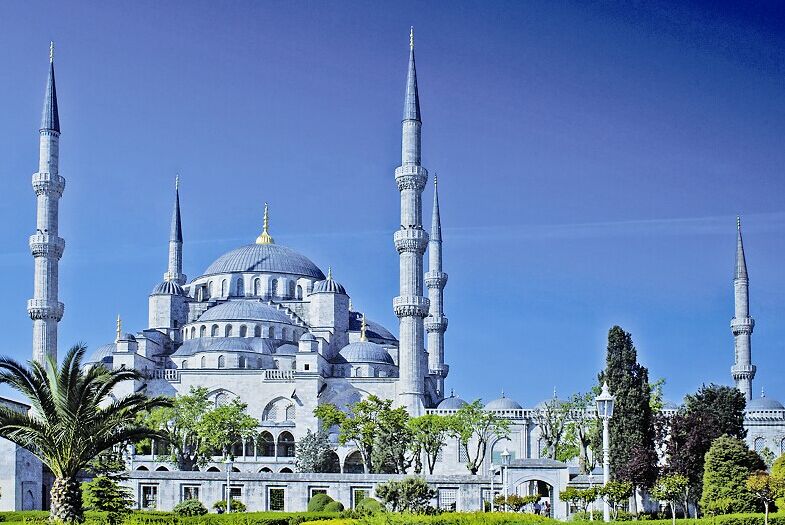 ※ 藍(lán)色清真寺:藍(lán)色清真寺,在1609--1616年間建造完成,清真寺內(nèi)墻壁全部用藍(lán)、白兩色的依茲尼克磁磚裝飾,透過彩色玻璃射入的光線,反射在蘭色的瓷磚之上,放出奇幻迷離的色彩,于是人們叫它“藍(lán)色清真寺”。它是伊斯坦布爾清真教徒每日的朝拜處。巨大的原頂周圍有六根尖塔,藍(lán)色清真寺是世界十大奇景之一。建造藍(lán)色清真寺沒有使用一根釘子,而且歷經(jīng)數(shù)次地震卻未倒坍。260個小窗、2萬多塊藍(lán)色磁磚、地毯和阿拉伯書法藝術(shù)是該寺的重要看點(diǎn)。