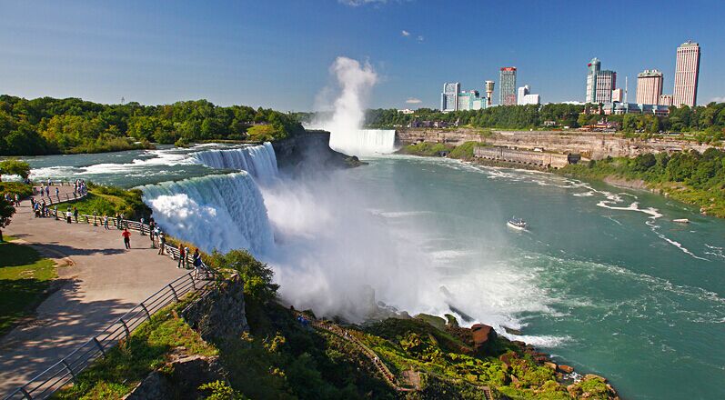 早餐后乘車前往【尼亞加拉大瀑布】,瀑布位于加拿大和美國交界的尼亞加拉河中段地區(qū),有著世界七大奇景之一的美譽, 同時也是世界三大瀑布之一。它以宏偉的氣勢,豐沛而浩瀚的水汽,震撼了所有的游人。從伊利湖滾滾而來的尼亞加拉河水流經(jīng)此地,突然垂直跌落51米,巨大的水流以銀河傾倒之勢沖下斷崖,聲及數(shù)里之外,場面震人心魄,形成了氣勢磅礴的大瀑布。抵達后在尼亞加拉大瀑布畔自由活動(約1.5小時),期間建議行程:自費搭乘瀑布游船(約1小時)(溫馨提示:特殊情況游船關(guān)閉,由此給您帶來的不便敬請理解)從1846年初航開始,“霧中少女”號瀑布游船始終是尼加拉瀑布最有名的玩樂方式,穿上薄薄的藍色雨衣,搭上那艘白色的雙層游船,最刺激的瀑布之旅便展開了??雌饋眍H有歷史卻很堅固的霧中少女號,會從河岸一路勇猛地駛向瀑布,并進入瀑布的馬蹄形中轉(zhuǎn)圈,豐沛的河水有如萬馬奔騰向你撲來,頓時船上的陌生人似乎都變成同船共渡的淪落人,就在一片朦朧水花中,你可以親身感受瀑布的氣勢和威力。脫離暴風(fēng)圈之后的霧中少女號,有如歷劫歸來的小船,搖搖晃晃地飄向美國瀑布,天氣晴朗時,太陽光和水氣交織出又長又美的彩虹,投射在名副其實的“彩虹大橋”前。