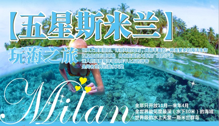 早餐后乘車前往碼頭,乘快艇前往【SIMILAN斯米蘭群島】,9個島中我們挑選了其中**美麗的4個島,去盡情的游泳與浮潛。同時可以在銀白色的沙灘上自由活動。斯米蘭島的美麗是無法用言辭來形容的,只有您的親身體驗,才能感受它的獨特魅力。首先我們參觀其中**美麗的【4號安島(Koh Miang)】,這里大片堅固的珊瑚礁高度逐漸地降低到大概30-40米,由于海水深度的增加,這個位置被沙子所代替了。在這些島嶼周圍形成的旋渦狀的、營養(yǎng)豐富的水域有著大量色彩艷麗的熱帶魚, 在這些水域觀賞到巨大魚兒的機會是很少的,但是在這你也許會偶然碰到美洲豹鯊魚,甚至鯨魚。這里有二十多處合格的潛水點,有許多已發(fā)展起來擁有自己的國際聲譽。之后前往【 9號班古島(Koh Bangru)】上的【圣誕角(Chrismas Point)】,這里是以系列蜿蜒迷人的海灣而得名,多彩成群的藍(lán)鰭鲹,金槍魚穿梭其中,潛水愛好者您不妨體驗暢游其中的樂趣。后乘快艇往【8號斯米蘭島(Koh Similan)】享用午餐,8號斯米蘭島上的象頭巖(Elephant Head)可能是這群島嶼中**著名的潛水地帶,這里是以伸出海面到斯米蘭島西南角的、形狀不規(guī)則的巖石而命名的?!鞠删辰?Fantasy Reef)】, 是適合于勘探大量水下巖石形成的受歡迎的地點,同時在這也能碰到一些活的發(fā)光物體。我們可以在這里進行【浮潛】,一覽海底世界豐富的魚群,及五彩繽紛的珊瑚。