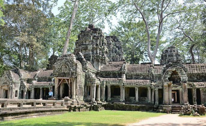 ※【達(dá)高神寺】又名“茶膠寺”茶膠寺原本是國(guó)王為自己興建的葬廟。作為一座未完成的建筑,茶膠寺記錄了吳哥建筑的建造工藝:先用石塊筑起整座建筑,再在墻壁表面雕刻佛像、浮雕。茶膠寺建筑為神山金字塔結(jié)構(gòu),三層平臺(tái)上建造五座蓮花塔,底層平臺(tái)長(zhǎng)120米、寬100米,中央塔高50米。登上寺頂可俯瞰通王城全貌。