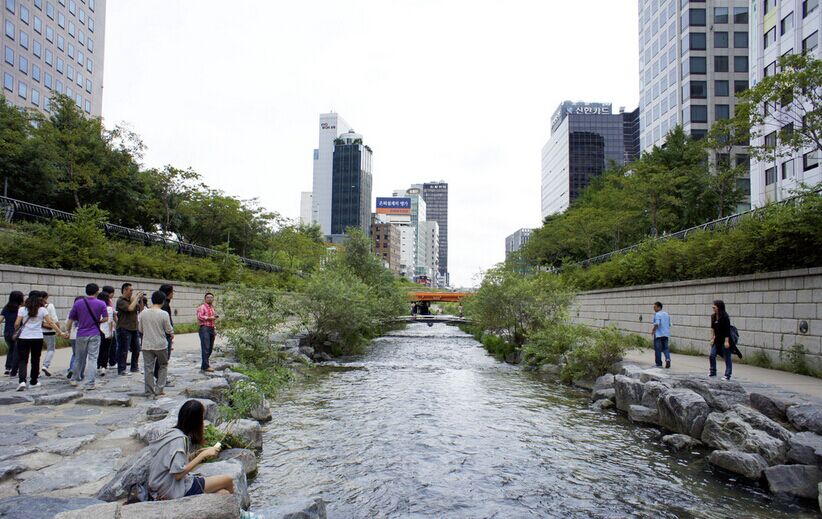 【清溪川】(約30分鐘)清溪川貫穿首爾南北,見證百年滄桑。近年水溝整治后,已被修建為了一條秀麗清新的小河,人們可以在岸邊散步聊天。清溪廣場(chǎng)位于清溪川源頭,標(biāo)志物是個(gè)形似海螺或是筍尖的雕塑,伴隨著溪水淙淙,意喻著新生。清溪川四周設(shè)立了很多文化空間,雕塑、繪畫、小橋都是拍照留念的不錯(cuò)景觀。