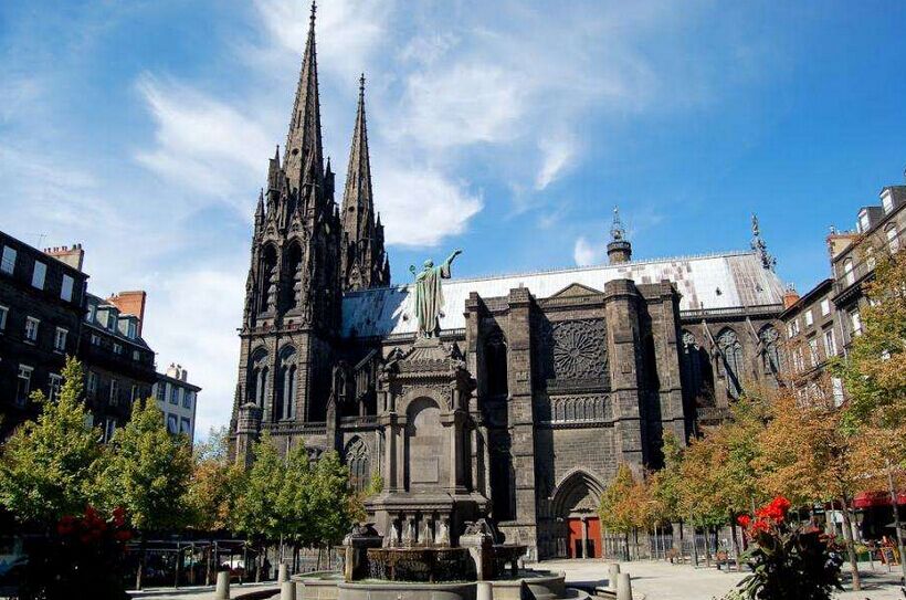 上午:乘車前往克萊蒙費朗,城內(nèi)的圣母教堂是世界上唯一一座用火山熔巖建成的大教堂,遠看就像是被煙熏黑了一樣;港口圣母教堂是奧弗涅羅馬式的代表建筑,被列入世界文化遺產(chǎn),老城漫步