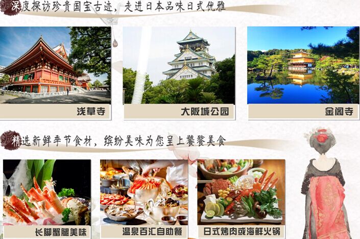 正宗料理  1、長腳蟹自助餐;2、傳統(tǒng)日式溫泉料理(溫泉酒店內(nèi));3、日式烤肉或海鮮火鍋