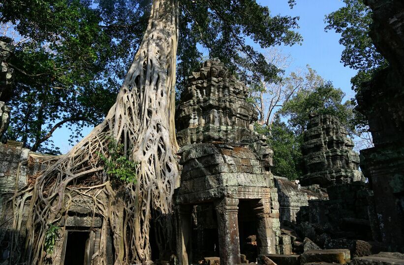 【塔普倫寺】高棉國王阇耶跋摩七世為祭祀母親而修建,是吳哥遺跡中的主要建筑。塔普倫寺正在被叢林吞噬,盤根錯節(jié)的熱帶樹木侵入石塊中生長,在撕裂建筑的同時也支撐著廟宇,使其不至于完全坍塌。也許很多年后塔普倫寺會徹底湮沒于叢林,但目前仍然可以欣賞參天巨樹與高棉寺廟令人驚嘆的糾纏。電影《古墓麗影》曾在這里取景。