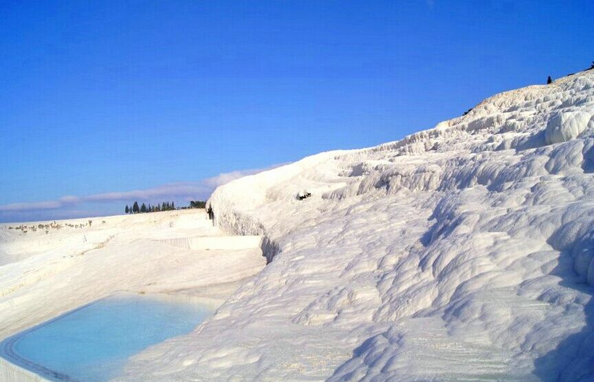 ※ 棉花堡:棉花堡(Pamukkale)在土耳其的紡織工業(yè)重鎮(zhèn)代尼茲利(Denizli),位于西南部山區(qū)。土文Pamukkale由Pamuk(棉花)和Kale(城堡)兩個字組成,棉花是指其色白如棉,遠(yuǎn)看像棉花團(tuán),其實(shí)是堅(jiān)硬的石灰?guī)r地形。城堡是說它由整個山坡構(gòu)成,一層又一層,形狀像城堡,故得名棉花堡。此地多溫泉,溫泉自洞頂流下,將山坡沖刷成階梯狀,平臺處泉水蓄而成塘,人可坐在里面泡溫泉。